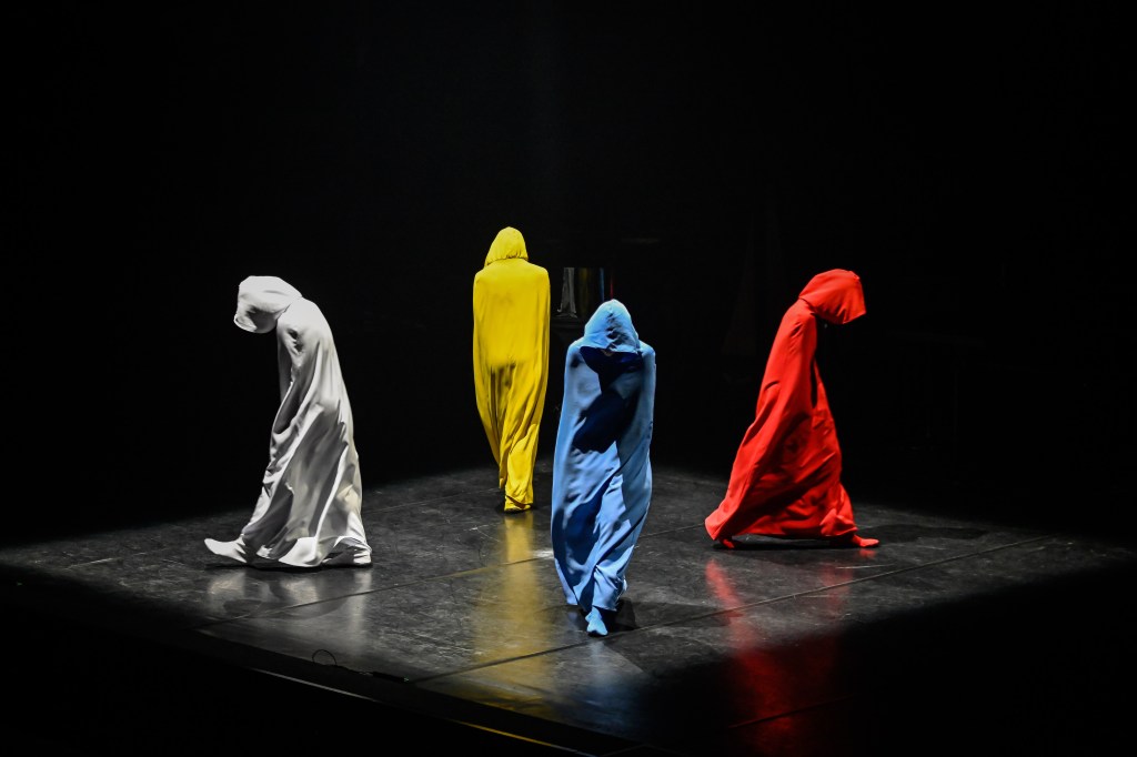 In the pre-concert talk, Rowland Hill commented on how, in a play as stripped back as Quad, every tiny detail of performance ‘reads’: with four walkers in simple, single-colour robes, moving at the same pace, the minutiae of posture, body angle, and movement-style all gain significance. We can read resignation or defiance into the degree to which a head is bowed; despair or exuberance in the speed and angle at which a walker’s leg rises and falls. The production had been designed and produced with meticulous care and attention in this respect, to great effect. There was one choice that, to me, seemed less effective: the robes were made of a fluid, somewhat clinging fabric that caught the light and enhanced the colours successfully, but also revealed the shapes and movements of the bodies perhaps a little too well; more so than with a stiffer fabric, which would define the bodies less precisely. Throughout, and especially in Quad II, these were perhaps too strikingly and obviously the lithe, energetic, trained bodies of dancers. Of course, the piece requires great bodily control and, in Quad I, energy, but the choice of fabric can either emphasise or disguise the quality of that physicality. Simply slowing the pace for Quad II is perhaps not quite enough if the movement is visibly agile and energetic and the costumes emphasise that liveliness. Nevertheless, this barely detracted from the power of the performance.