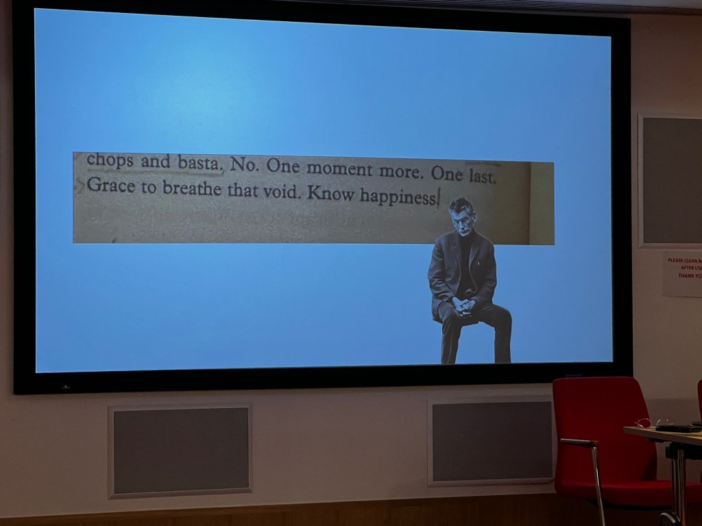 Nowhere was this more apparent than in the panel on Beckett and Suzanne Dumesnil, a session that did not just expand the field but reoriented it. Emilie Morin’s paper traced Dumesnil’s emergence not as a shadow or footnote, but as a writer with stylistic and thematic integrity. Her typescripts are no longer seen as anomalies but as a body of work with quiet urgency. Julie Bates’ reading of ‘F—’ and ‘Contre-Jour’ explored these echoes further: how the writing of Beckett and Dumesnil moved side by side, voicing memory, affection, and solitude in overlapping frequencies. And Dúnlaith Bird’s haunting reading of Musique Jeux and ‘Françoise’ turned the conversation toward presence as erasure, toward the archival ghosts and literary phantoms that structure what we call “Beckett Studies.”