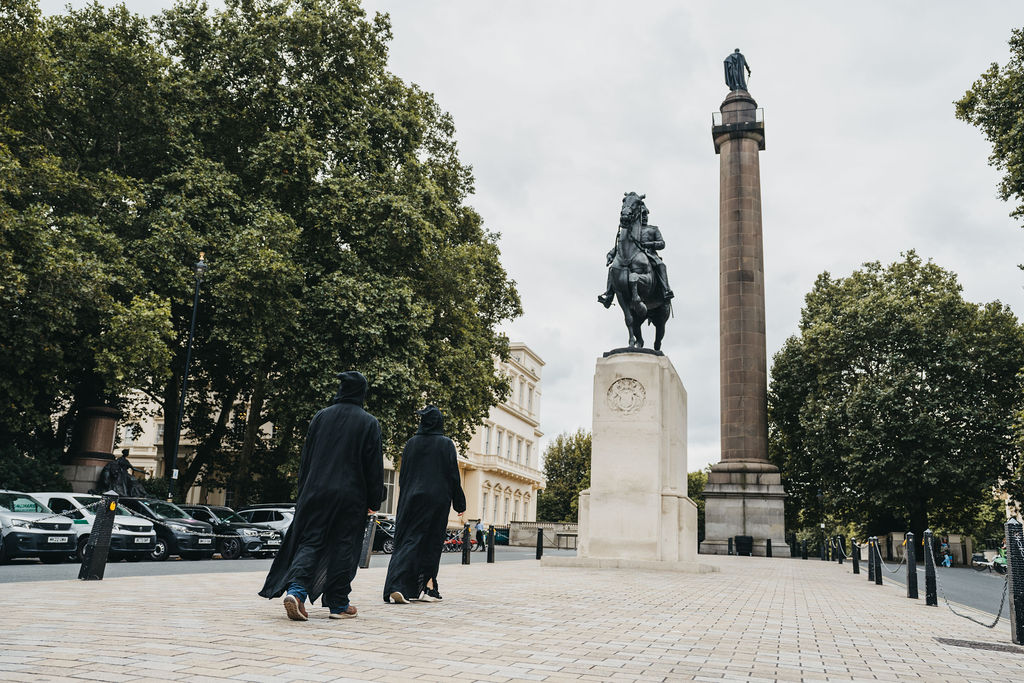 Likewise, the play necessarily invites altered consideration of the environment. At a certain point, the walkers cut away from Jermyn Street and begin the passage down to St. James’s, where we participate in a turn about the garden square, amid the flush Georgian townhouses of private members clubs and high-end marketing agencies. Here, the clamour of Leicester Square and the flashing screens of Piccadilly are replaced by Chatham House and the stately yet oddly attenuated entrance to 1 St. James’s Square: the London headquarters for BP. In this context, the funereal procession takes on a strange new meaning. Making our way back up, we pass a few shrilly lit office buildings: mostly empty, except for a lone security guard or a few Londoners working overtime, hunched over a laptop screen. All the while, dimly underneath the cushion of headphones, the ominous growl of the city adds a further transformative detail to the play’s sonic power.