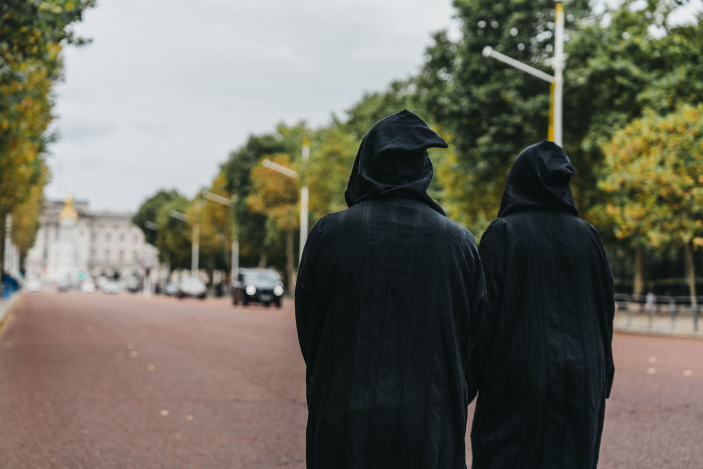 Shortly after arriving at Jermyn Street Theatre – a venue with its own sturdy history of notable Beckett productions – a robe and headphones (with attached iPod Nano) are handed to the audience who remain cloaked, listening to the pre-recorded play for the duration of the walk.1 Since 2016, the performance has itself roamed widely across locations in London, Dublin, Berlin, New York City, and as far as Xichang, China (the last time Cascando was performed in London in 2023 found Pan Pan’s walkers roaming the brutalist cloister of the Barbican Centre). Throughout, the company has acquired a reputation for multimedia and experimental approaches on the cutting edge. Just before setting out again, Pan Pan artistic director Gavin Quinn offers a few introductory remarks, commenting that the dark robes place the audience in a unique position of being both anonymous and observed. As the performance begins and the audience sets out in single file, truncated under-robe glimpses (you are encouraged to keep your head down) reveal Jermyn Street’s glassy facades, from high-end footwear to glossy bookstores. The total effect is somewhere between a live art installation and a silent disco from hell.