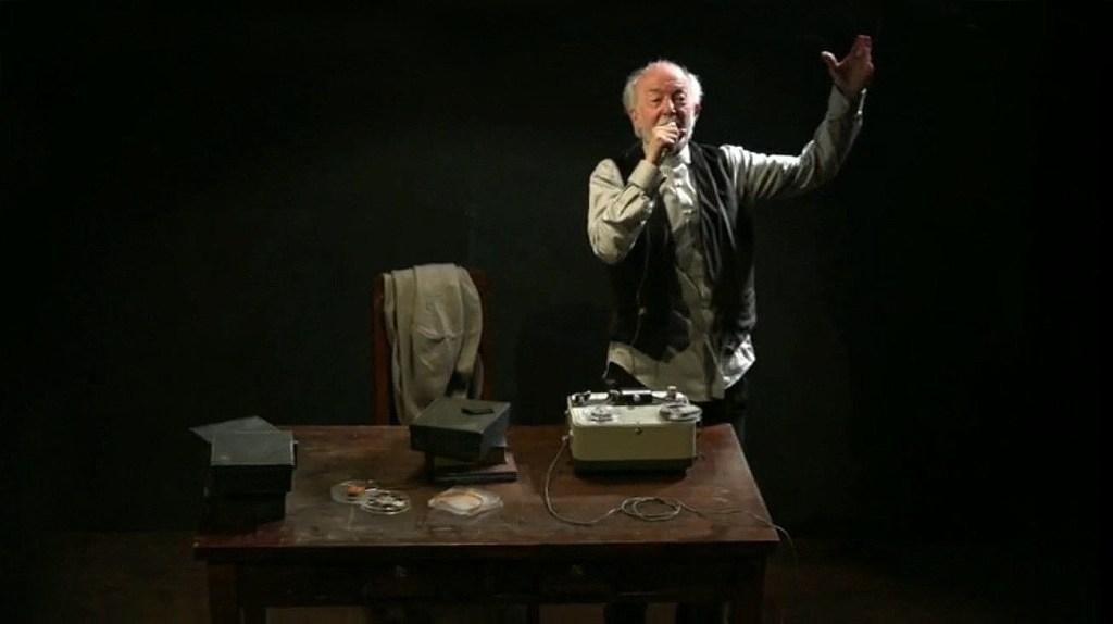 Some interesting scaffolding – movements that support meanings – features in this version. When Krapp-on-tape mentions that ‘the blind went down’ (indicating the window of the room where his mother was dying) Magee slowly closes his eyes, highlighting the power and embodiment of the metaphor: blinds go down, like eyelids in death. Another significant moment is when Magee stops the recording because he ‘realizes he is recording silence‘ (222).5 Here again the power of the metaphor – albeit in this case only a stage direction – is stressed: if Krapp died now – one of the possibilities of ‘last tape’- the tape would go on, recording silence. In another poignant moment accomplished through FOVs, Magee, recording with a decisive voice, is interrupted by involuntary recollections, which burst out with a distinctive mellow tone: ‘the eyes she had!’ (222).