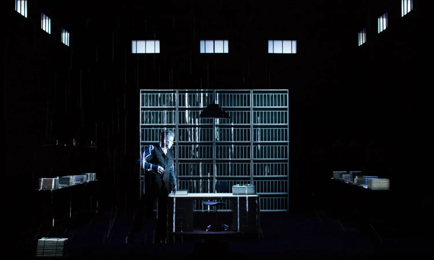 Wilson´s acting style is non-naturalistic, anti-Stanislavskian, based on formalism, minimalism and a stylised theatricality, also influenced by dance and the Noh theatre. He uses slow-motion, repetitions and fixed positions. This version respects Beckett´s dialogues but also exaggerates features and adds elements. Numerous sound and lighting effects, a hallmark of Wilson´s theatre, are used. One added element is the long opening scene with an intense sound- and light-created rain effect. Upper ‘bars’ created with lighting and tidy shelves at both sides are also added. Wilson´s face remains inexpressive or so flooded with light as to be indiscernible. Analysis revealed a large amount of accentuated modulation of FOV instances, where the FOV in movement, light or sound is aesthetically modulated, emphasised confluence of FOVs in more than one dimension, where the FOVs in two or more dimensions emphatically coincide (e.g. Wilson abruptly drops the ledger on the desk in synchrony with a sudden change of light and loud sound), and stylized segment of a goal-directed action, when part of an action is stylized – usually slowed down — for aesthetic effect.