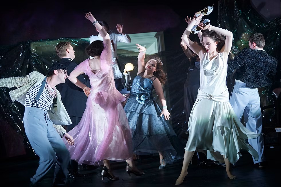 Director Sarah Jane Scaife, renowned for her many innovative productions of Beckett, emphasises the progressive darkening of the tone within the play. The sharp-tongued fecklessness of the first act descends to a gloomy anxiety by the end. She also insists on the importance of the ‘youth’ in the play’s title by casting as close to age-appropriate as possible (the twenty-one-year-old Desmond is played by the twenty-five-year-old Rawle) which produces a heightened nervous energy sustained throughout the night. To huge effect, the second act party becomes a highly stylised and increasingly choreographed affair, accompanied by an unsettling score which gives the whole a feeling of danse macabre with Egosmith pulling the strings at its centre. Scaife also elevates the themes of political decay, loss, ennui, dissipation, colonialism, female stasis, and queerness which punctuate the complicated text. As a result, the play fizzes with the anxiety and gauche bravura of a distinctly edgy group of youngsters horribly aware of the constrained hands they have been dealt but without the wherewithal to escape. Terence’s suicide is deemed a heroic act of courage by Desmond who, in turn, submits to ‘the bowler hat and the umbrella’ of a job in the family firm.